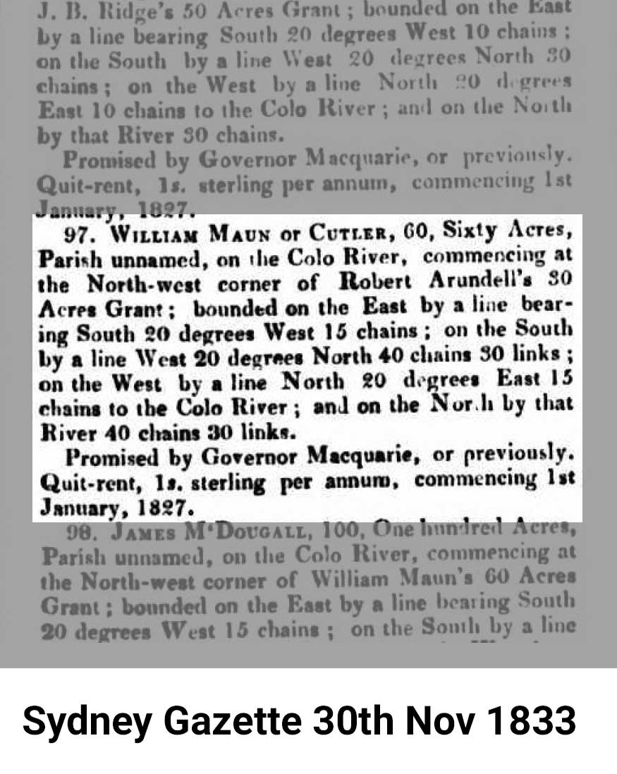 William Maun had an infamous mother. William’s mother was Martha Cutler who was transported on the Lady Juliana in June 1789 in for being a highway robber.  Female highway robbers were not common and the case is well recorded. Martha and her two other female highway robbers were tried at the Old Bailey and given a choice of transportation to Australia or death. Martha chose transportation and married Jospeh Maund and they had one child, William Cutler Maun (born 1800) who was granted the 60 acres on the Colo in 1833. You can read more about Martha Cutler here: